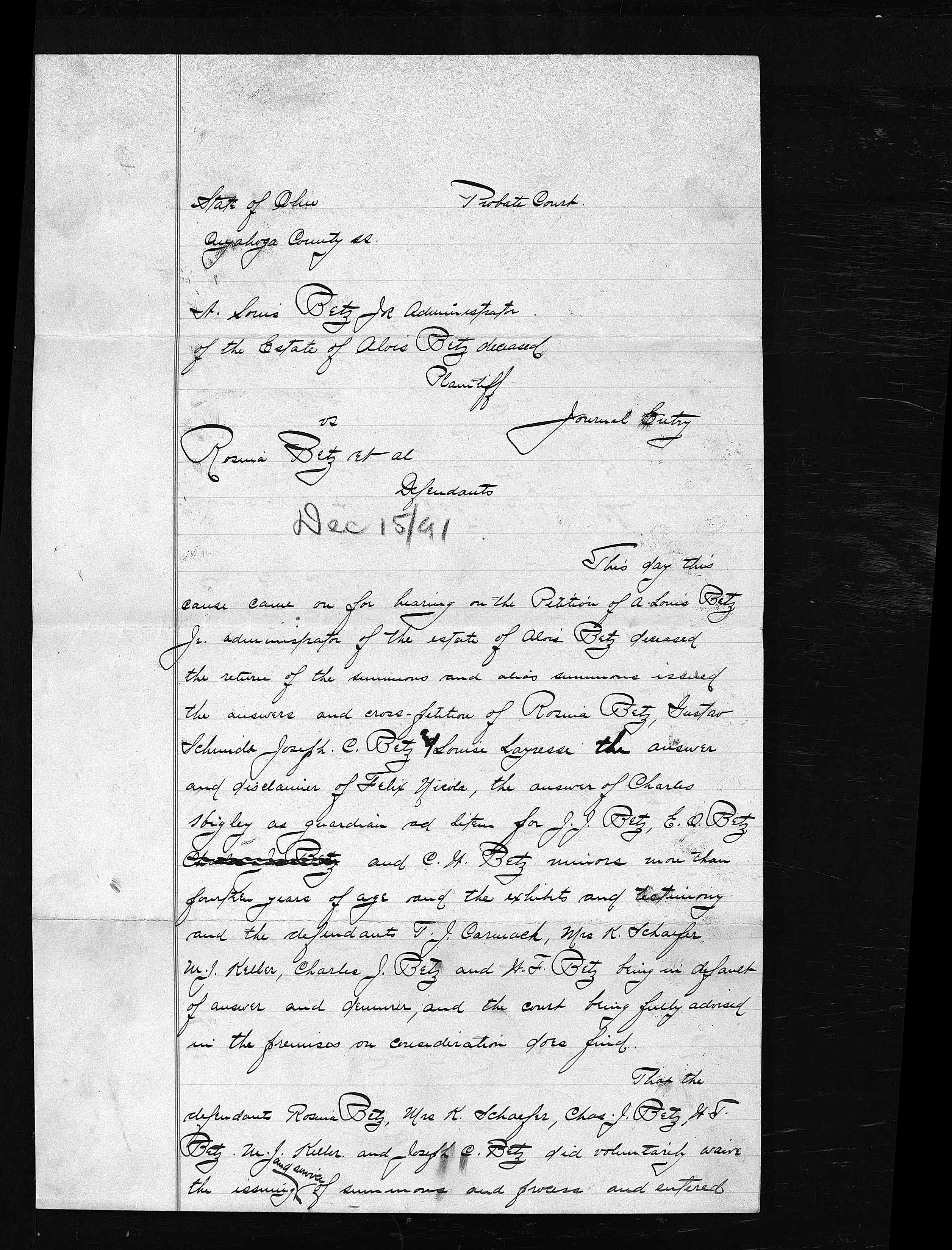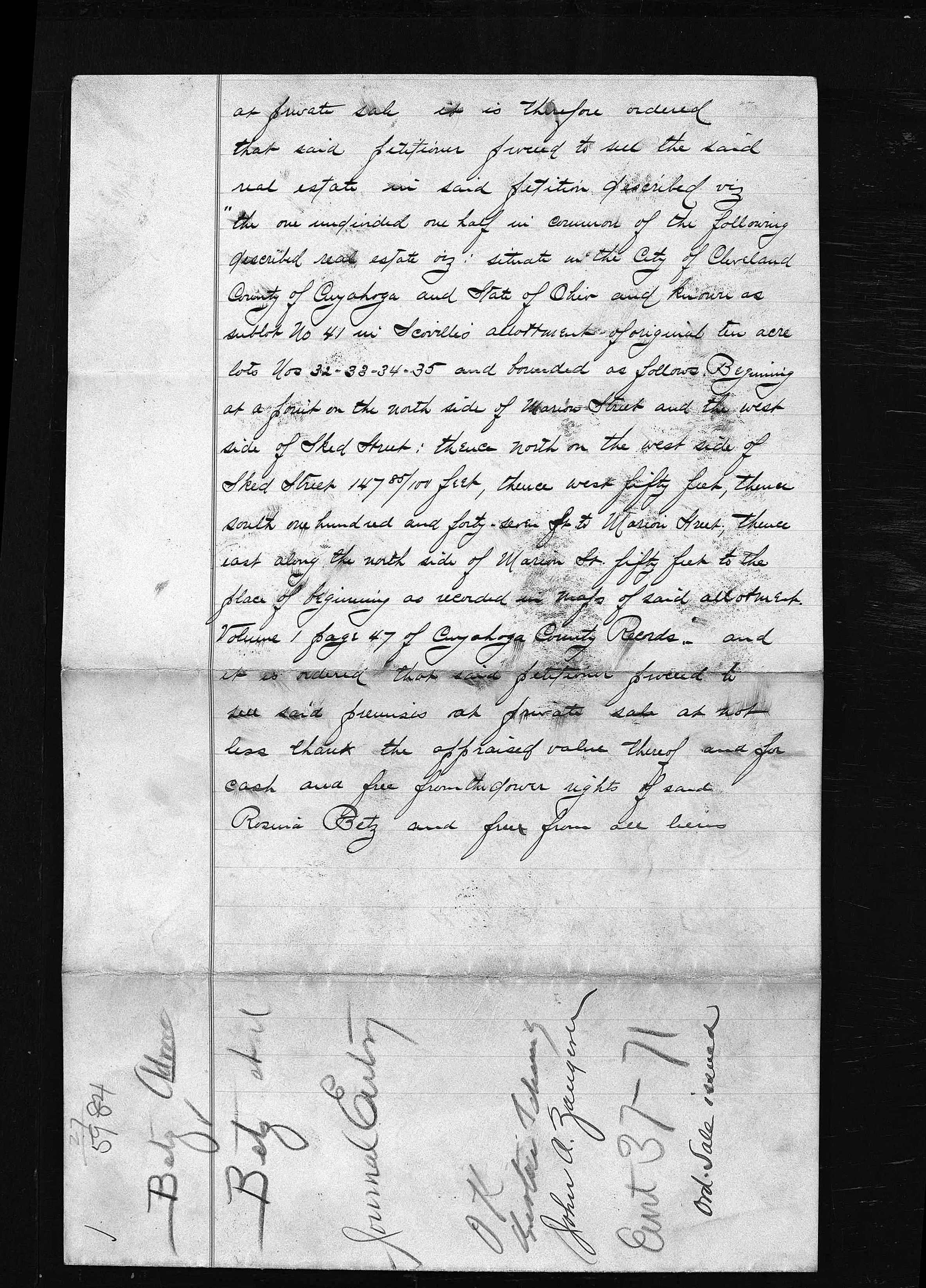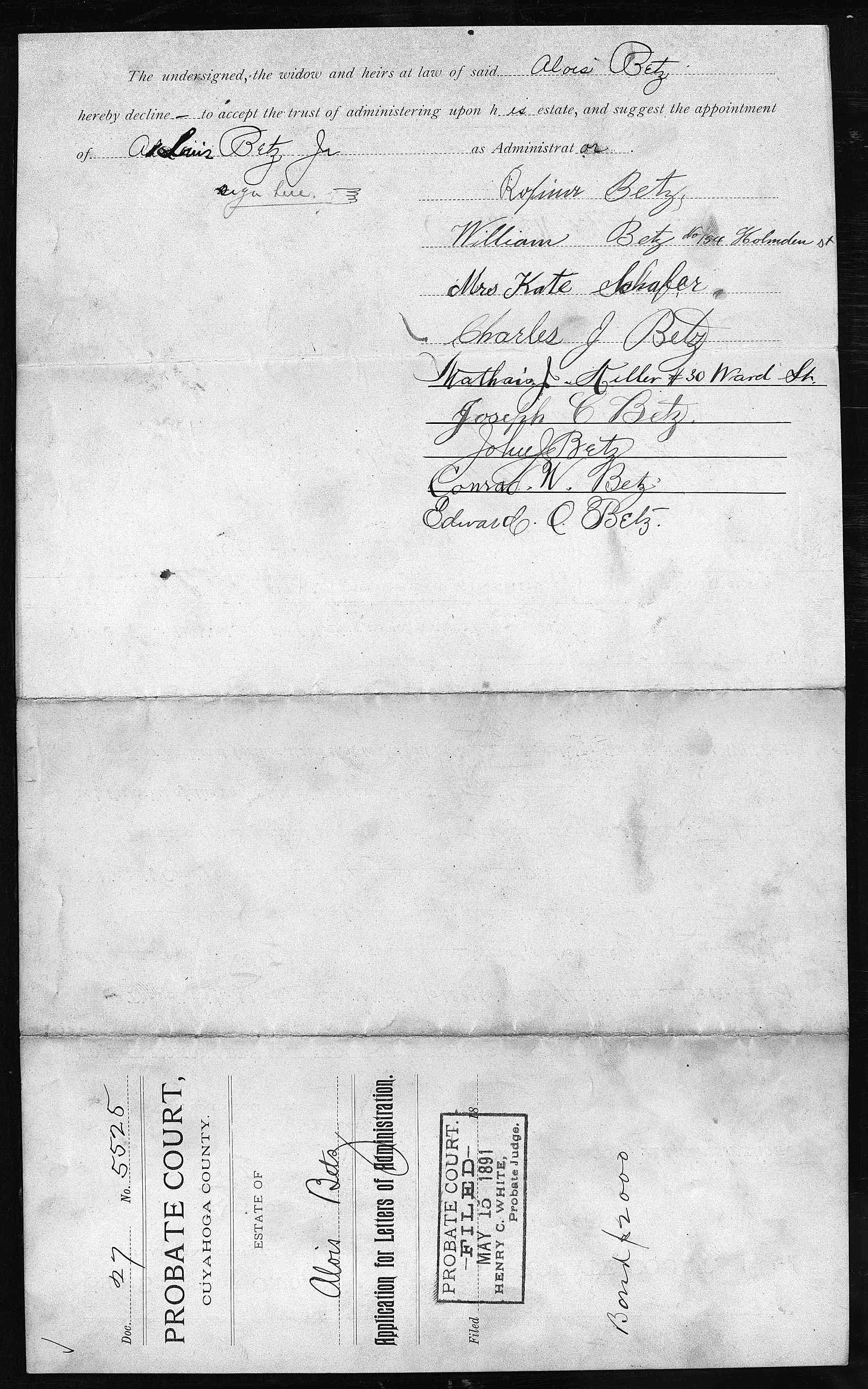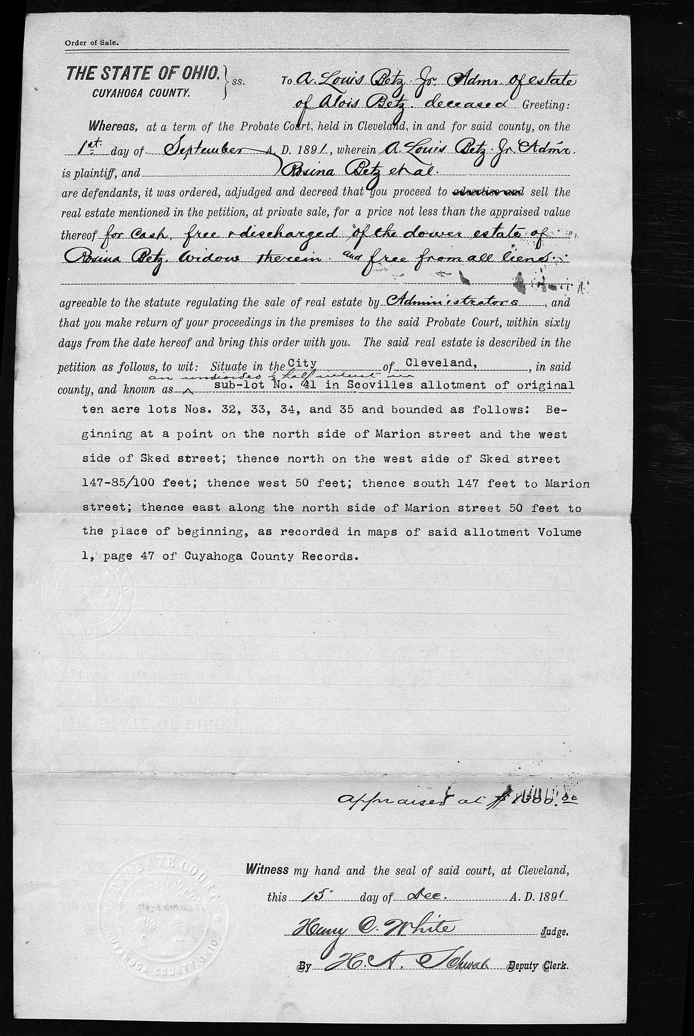 The album below contains the archived records of the Cuyahoga County Probate Court regarding the settlement of Alois Betz’s estate after his death in April of 1891. No interpretation or image processing has been done on these records. The file names reflect the case index number and page number, respectively. There are two cases represented here. I don’t know enough about the process to interpret them, other than to say that 5525 seems to be the general probate process, and 5984 relates specifically to the sale of the Marion Street residence.