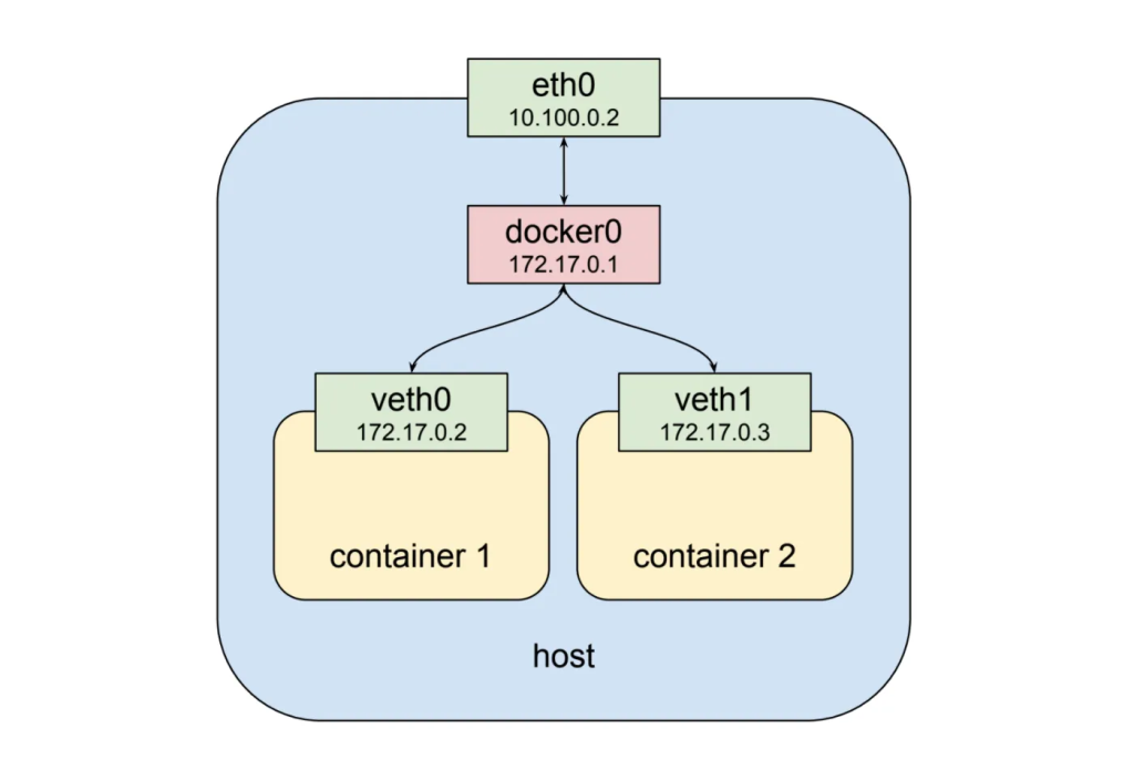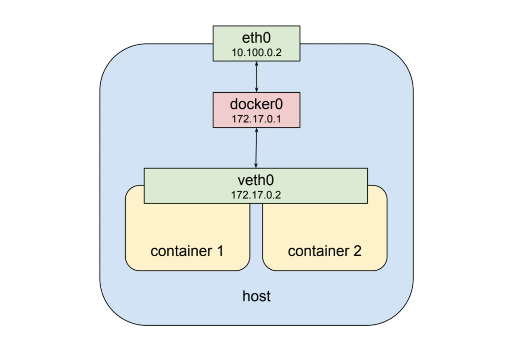As shown above the second container gets a new virtual network interface veth1, connected to the same docker0 bridge.* This interface is assigned 172.17.0.3, so it is on the same logical network as the bridge and the first container, and both containers can communicate through the bridge as long as they can discover the other container’s IP address somehow.