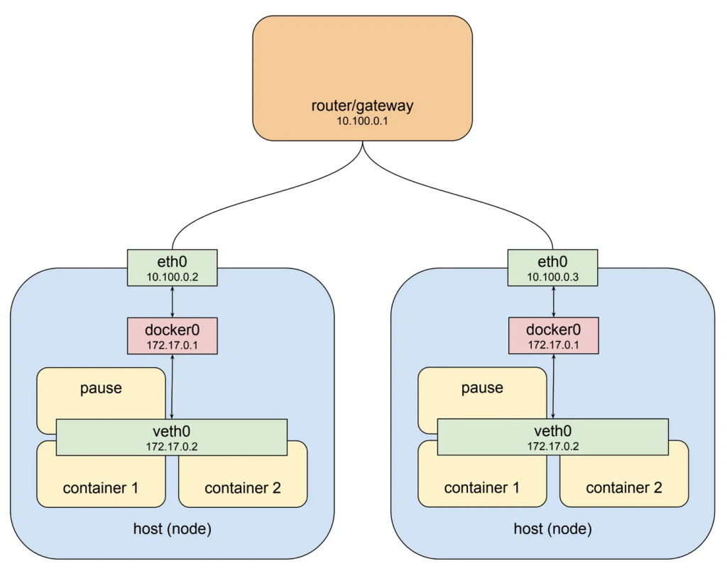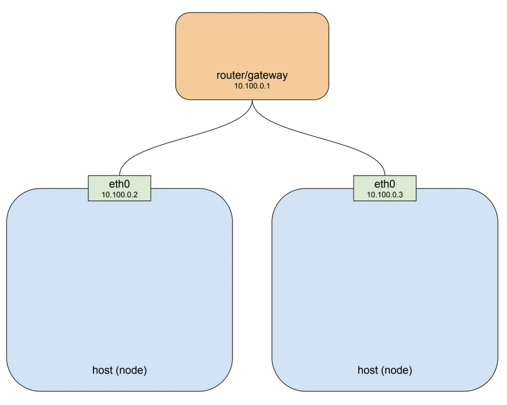 If you’re running your cluster on a cloud platform like GCP or AWS that drawing pretty well approximates the default networking architecture for a single project environment. For the purposes of illustration I’ve used the private network 10.100.0.0/24 for this example, so the router is 10.100.0.1 and the two instances are 10.100.0.2 and 10.100.0.3 respectively. Given this setup each instance can communicate with the other on eth0. That’s great, but recall that the pod we looked at above is not on this private network: it’s hanging off a bridge on a different network entirely, one that is virtual and exists only on a specific node. To make this clearer let’s drop our pod-like things back into the picture:
